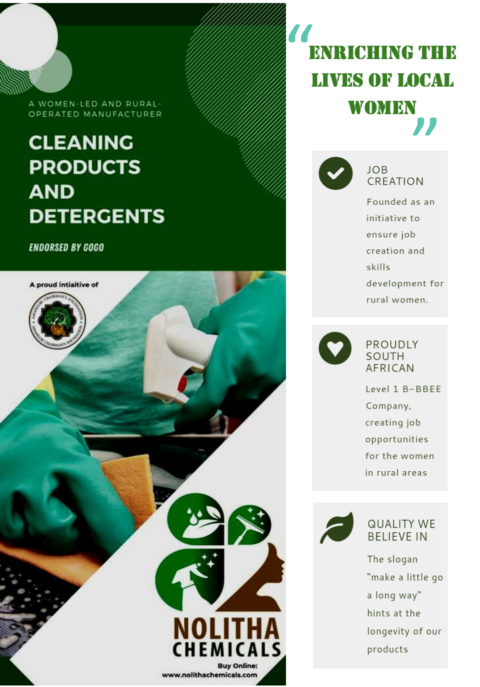 The main goal of Nolitha Chemicals is to create job opportunities to the women in rural areas so that they can provide for their families and be active contributors to the economic cycle in their respective local communities. The products sold by Nolitha Chemicals are a local alternative to what is already available in the market, however it is clear to the user that there is a noticeable difference in quality as there is a much more attention to detail, and care taken in the manufacturing process.